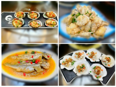 讓人目不暇接、食指大動的美味海鮮,深海小黃魚,銀鯧、龍頭魚,鮮魷、梭子蟹、花甲......幾十種海鮮整齊擺列。