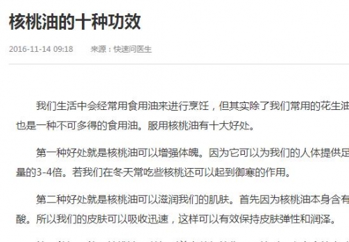 我們生活中會(huì)經(jīng)常用食用油來進(jìn)行烹飪,但其實(shí)除了我們常用的花生油、玉米油、菜籽油和橄欖油,核桃油其實(shí)也是一種不可多得的食用油。服用核桃油有十大好處。 第一種好處就是核桃油可以增強(qiáng)體魄。因?yàn)樗梢詾槲覀兊娜梭w提供足夠的熱量,它所釋放出來的熱量是米飯熱量的3-4倍。若我們?cè)诙斐3孕┖颂疫€可以起到御寒的作用。 第二種好處就是核桃油可以滋潤我們的肌膚。首先因?yàn)楹颂矣捅旧砗信c皮膚親和力極佳的角鯊和人體必須脂肪酸。所以我們的皮膚可以吸收迅速,這樣可以有效保持皮膚彈性和潤澤。 第三種好處就是核桃油可以起到美容養(yǎng)顏的作用。特別是它富含的脂肪酸和角鯊?fù)榭梢允沟闷つw衰老得到很好的延緩,保持皮膚彈性,使肌膚潤澤飽滿。 第四種好處就是核桃油可以使得我們的秀發(fā)變得更加靚麗。因?yàn)槌3院颂矣涂梢允沟梦覀兊念^發(fā)變得烏黑濃密,有光澤。 第五種好處就是核桃油有健腦養(yǎng)腦的作用。核桃油本身含有豐富的亞油酸和亞麻酸能排除血管內(nèi)新陳代謝的雜質(zhì),使血液凈化,為大腦提供新鮮血液。它沒有膽固醇,所以可以預(yù)防老年癡呆。 第六種好處就是核桃油有預(yù)防心腦血管疾病的作用。核桃油中富含不飽和脂肪酸、維生素等等,這些物質(zhì)可以替我們預(yù)防動(dòng)脈硬化及動(dòng)脈硬化并發(fā)癥、高血壓、心臟病、心力衰竭、腎衰竭、腦出血發(fā)生。 第七種好處就是桃油有提高內(nèi)分泌系統(tǒng)功能的作用。因?yàn)楹颂矣椭械腄HA可以提高胰島素的敏感性,當(dāng)細(xì)胞中不飽和脂肪酸含量越高,擁有的雙健數(shù)量越多,其活動(dòng)性就越強(qiáng)。所以它有提高內(nèi)分泌系統(tǒng)功能的作用。 第八種好處就是核桃油可以補(bǔ)鈣。核桃油中的天然抗氧化劑和ω-3脂肪酸有助于人體對(duì)礦物質(zhì)的吸收如鈣、磷、鋅等,可以促進(jìn)骨骼生長,保持骨密度。 第九種好處就是核桃油可以促進(jìn)視網(wǎng)膜發(fā)育。因?yàn)楹颂矣椭懈缓坏膩喡樗峒熬S生素A,這兩種營養(yǎng)物對(duì)視網(wǎng)膜的發(fā)育至關(guān)重要.防止夜盲癥和視力減退,所以可以促進(jìn)視網(wǎng)膜發(fā)育。 第十種好處就是核桃油可以保護(hù)腸胃、潤腸通便和滋潤肺腑。我國中醫(yī)認(rèn)為核桃油本身可以潤腸通便,是便秘人士的福音,但是也不能吃太多,因?yàn)楹颂矣捅旧硪彩欠浅H菀资谷松匣鸬?。摘自:快速問醫(yī)生