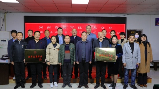 原防空兵學院基礎部大校政委、河南省擁軍優(yōu)屬基金會副理事長王海洲向愛國擁軍企業(yè)頒授牌匾、及證書,并合影。