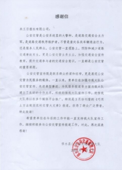 希望貴單位在今后的工作中能一直支持我大隊(duì)宣傳工作,繼續(xù)積極參與公安交管的宣傳報(bào)道工作,對(duì)此,再次深表感謝!