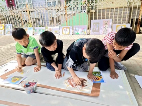 白色的長卷在活動現(xiàn)場一字鋪開,小朋友們圍坐在長卷畫紙旁,這些參與活動的孩子們都擁有自己的一片繪畫小天地,在這一片小天地里面,她們拿起手中的畫筆,以自己獨(dú)特的視角,豐富的想象力,繽紛的色彩,創(chuàng)作出童趣、童真、童心的作品。