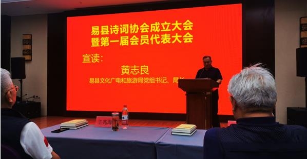 易縣文化廣電和旅游局局長黃志良宣讀《易縣文化廣電和旅游局關(guān)于同意易縣詩詞協(xié)會成立登記并作為其業(yè)務(wù)主管單位的函》。