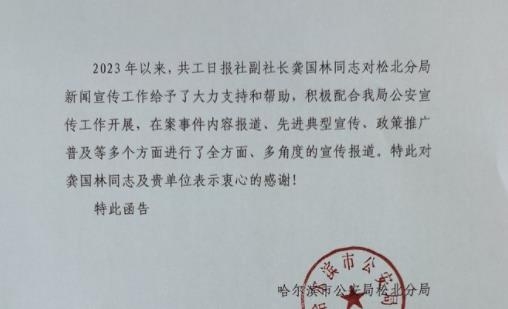 2023年以來,共工日?qǐng)?bào)社副社長(zhǎng)龔國(guó)林同志對(duì)松北分局新聞宣傳工作給予了大力支持和幫助,積極配合我局公安宣傳工作開展,在案事件內(nèi)容報(bào)道、先進(jìn)典型宣傳、政策推廣普及等多個(gè)方面進(jìn)行了全方面、多角度的宣傳報(bào)道。特此對(duì)龔國(guó)林同志及貴單位表示衷心的感謝!