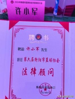 許小軍律師在接過(guò)證書(shū)后,也發(fā)表了自己的感言。他表示,非常榮幸能夠成為衡陽(yáng)市籃球協(xié)會(huì)的常年法律顧問(wèn),將為協(xié)會(huì)的法律事務(wù)貢獻(xiàn)自己的力量。同時(shí),他也強(qiáng)調(diào)了體育法律事務(wù)的重要性,表示將秉持著公正、公平、專(zhuān)業(yè)的原則,為協(xié)會(huì)提供優(yōu)質(zhì)的法律服務(wù)。