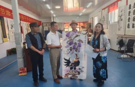 據(jù)王世軍介紹,《藤吉福來》以“藤”為骨、“吉雞”為魂,通過骨法用筆與潑墨技法,營造出“藤蔓如龍、吉鳥似鳳”的視覺張力。畫面中,紫藤垂落如瀑,吉鳥振翅欲飛,動靜之間傳遞出對自然和諧與生命蓬勃的禮贊。