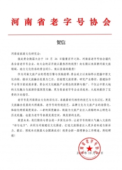 河南省旅游文化研究會第三屆第一次全體會員大會暨換屆大會在即,河南省老字號協(xié)會發(fā)來賀信,賀信全文如下: