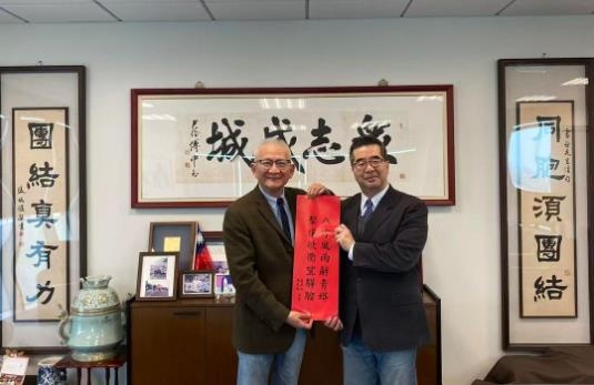 會后,蕭旭岑副主席向共工新聞社顧問鈕則堅(jiān)先生致贈(zèng)由馬英九先生書寫的春聯(lián),并一同合影留念。